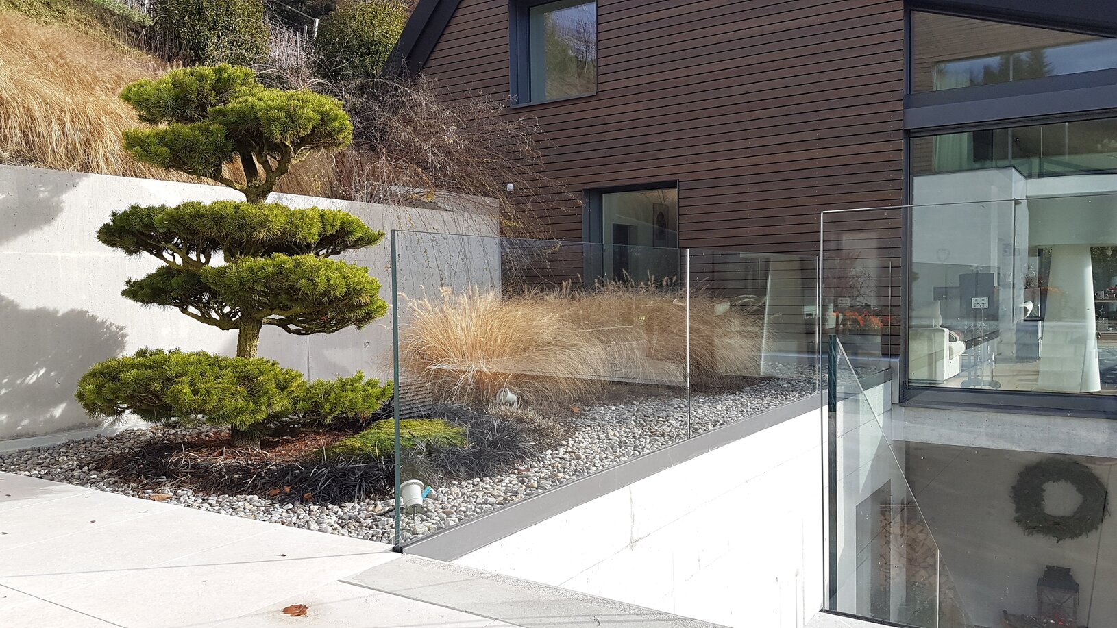 Ganzglasgeländer mit Holzhandlauf