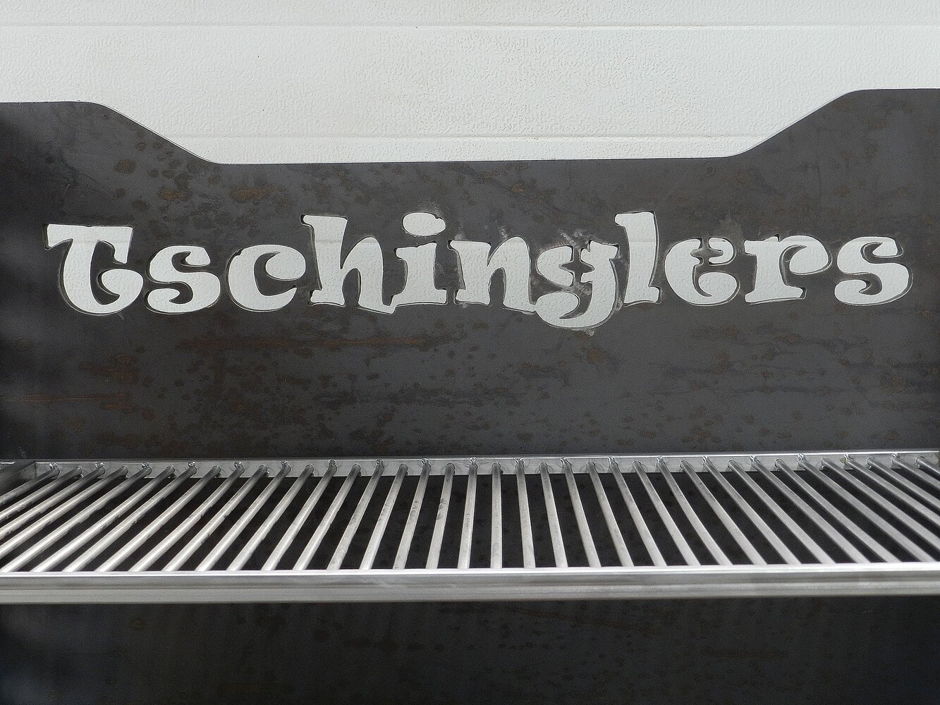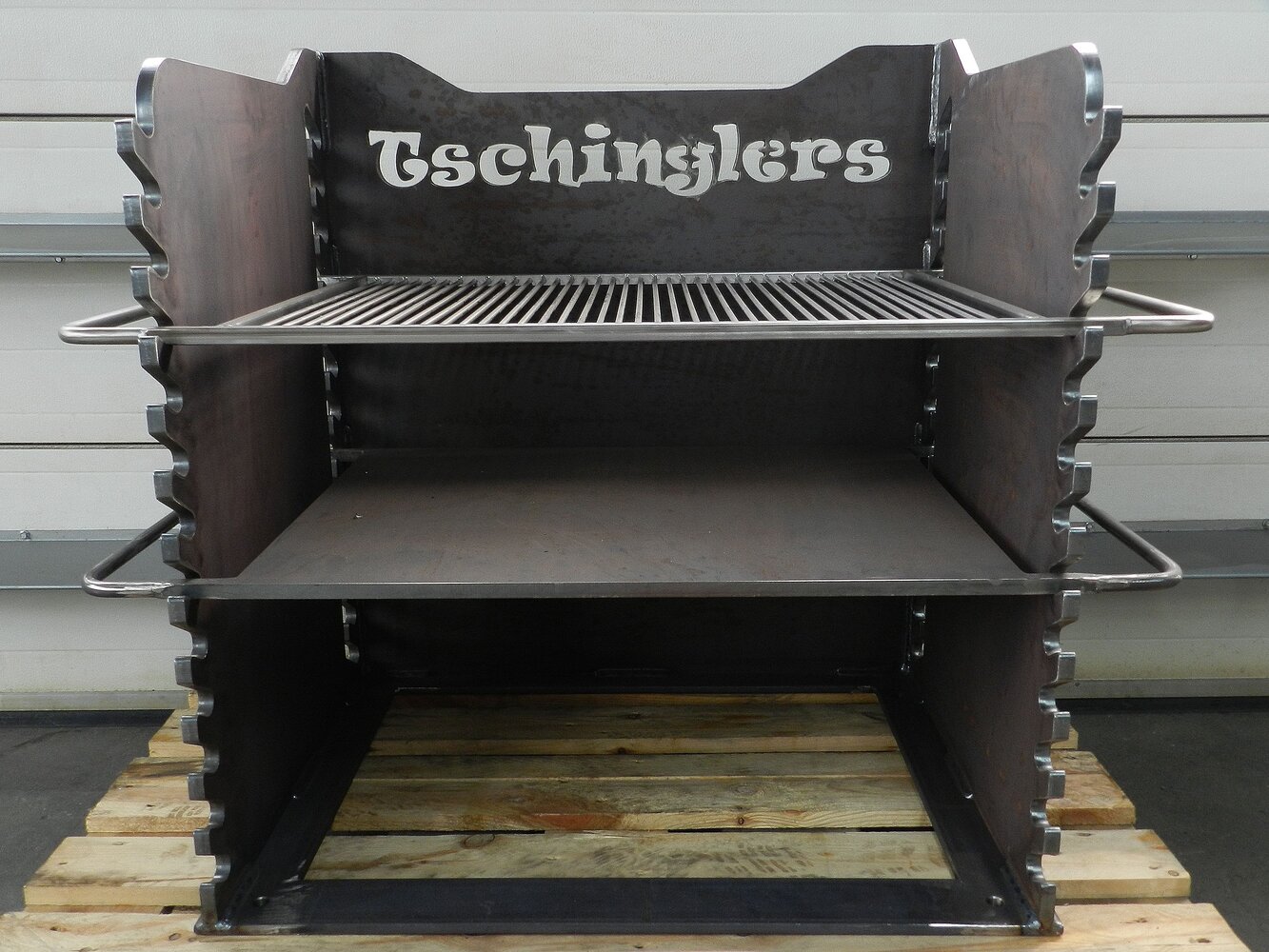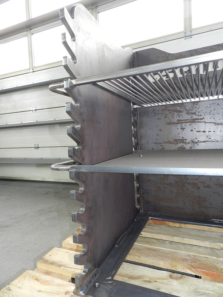 Das Grundgerüst des Grills wird aus gelaserten 15mm dicken Stahlblechen gefertigt. Diese Bleche können nach Wunsch mit einer beliebigen Gravur versehen werden.